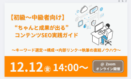 【初級〜中級者向け】“ちゃんと成果が出る” コンテンツSEO実践ガイド|キーワード選定→構成→内部リンク→執筆の直結ノウハウ2025/12/12(金)14:00〜14:45